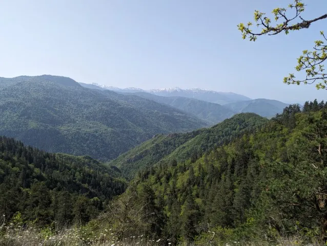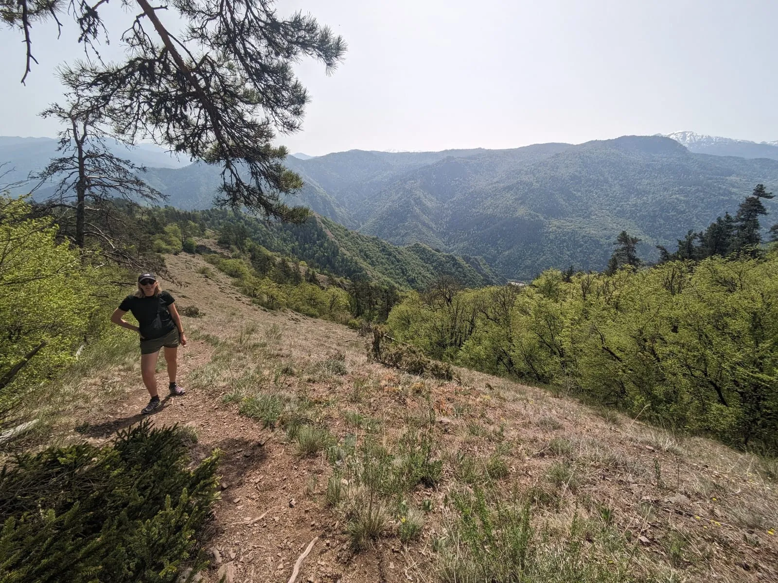 Früh am Morgen – es waren 35 Grad zu Beginn des Mais, als ich dort war – begann ich die Wanderung über den Valley Trail. Ich entschied mich, die Route gegen den Uhrzeigersinn zu gehen, da ich gelesen hatte, dass dies die Abstieg weniger herausfordernd machen würde. Es war ein wenig Mühe, den Startpunkt der Wanderung zu finden. Dieser begann auf einer improvisierten Brücke aus Ästen. Gefunden! Eingebettet zwischen einigen Wiesen, auf denen ich ein paar grasen Kühe passieren musste, fand ich mich plötzlich im Wald wieder. Kaum von der Hauptstraße abgebogen, begann der Aufstieg fast sofort. Es war ein steiler Anstieg, der Sie in etwa 40 Minuten auf den Gipfel auf 1.445 Metern bringt. Was die Wanderung besonders anspruchsvoll macht, ist, dass es nahezu keine ebenen Abschnitte gibt, um sich auszuruhen. Glücklicherweise war der Wanderweg komplett von Bäumen umgeben, sodass man herrlich im Schatten laufen kann. Nach ein paar benötigten Pausen erreichte ich nach ungefähr einer Stunde Wanderung den Gipfel. WAUW! Was für eine Naturschönheit! Soweit ich sehen kann, erkenne ich die zerklüfteten Berge des Kleinen Kaukasus, und in der Ferne sind die letzten Gipfel noch mit einer Schicht Schnee bedeckt. Durch diese pure Schönheit der unberührten Natur und der rauen Bergspitzen habe ich all die Anstrengungen und das gelegentliche Murren bereits schnell vergessen.