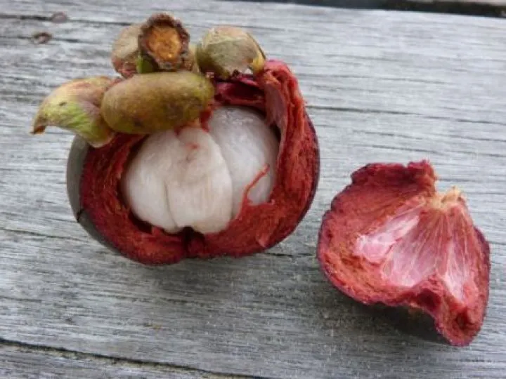 Für mich ist die Mangosteen oder Mangistan absolut die Königin der tropischen Früchte. So wie sie da liegt und mit ihrem kleinen grünen, dickblättrigen Krönchen mit dickem Stiel obendrauf wartet. Sie hat die Farbe einer rotbraunen Aubergine, doch sie ist klein und rund, etwa so groß wie eine ordentliche Mandarine. Ihre Schale ist außen hart und dick. Wenn man jedoch das Krönchen mit festem Griff zwischen Daumen und Zeigefinger abdreht und dann vorsichtig beide Daumen in das entstandene Loch drückt, um die Schale zu öffnen, sieht man, dass die Schale von innen weich und knallrot ist. So rot, dass man damit einen Farbstoff herstellen könnte. Ich wette, das wurde auch schon versucht. Tief im Herzen sitzt die Frucht. Klarweiße Scheibchen. Sechs, manchmal acht, in der Form eines Kreises, ähnlich wie bei der Mandarine. In den Scheibchen befindet sich manchmal ein hellbrauner Kern. Die Frucht fühlt sich seidenweich im Mund an. Nicht schleimig, sondern fest, ohne hart zu sein. Weniger glatt als Lychee, weicher als Mandarine. Und es schmeckt süß mit einer sauren Hülle. Ja, das ist es. Zart süß mit einem dünnen Film von Sauer darüber. Mein Gott, ich schmelze dahin.