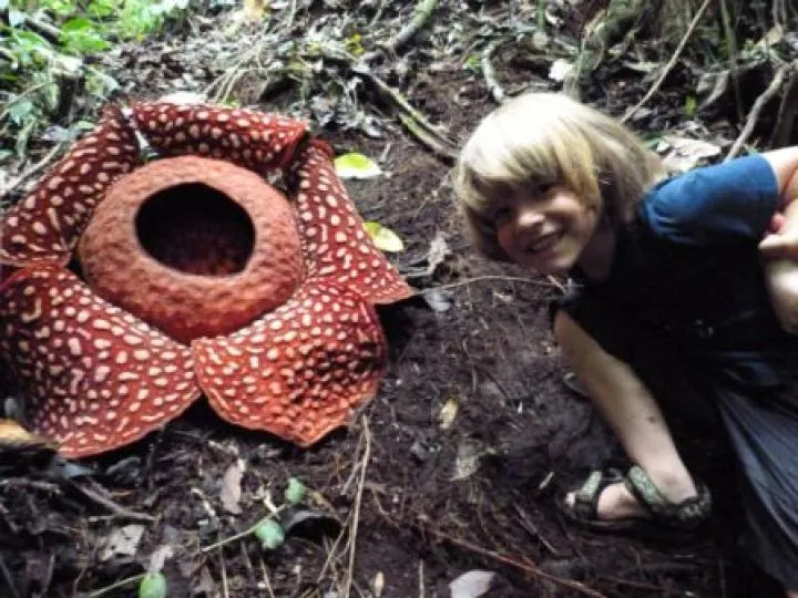 Das Laufen durch den Dschungel ist also ein Fest. Ein großes Fest. Denn der feuchte Schlamm ist eine Nahrungsquelle für die fantastischsten Blumen, Bäume mit den unglaublichsten Blattformen und Sträucher mit den schönsten Früchten. Das liegt an der konstant hohen Temperatur, die mein Blut erwärmt, aber gleichzeitig die Blumen zum Blühen bringt und die Bäume Früchte abwerfen lässt. Die fliegenden und kriechenden Wesen sorgen für die Bestäubung der Trompetenblumen, der Orchideen und unzähligen anderen bunten Blumen, die ich auf meinem Weg nach oben finde. Ich sehe den Kakaobaum, den Zimtbaum, wilde Jackfrüchte, Farne mit Blättern so groß wie Elefantenohren, Lianen so dick wie Unterarme, Blätter so groß, dass man ein Baby darin wickeln könnte. Staunend bahne ich mir langsam meinen Weg nach oben und höre dann einen Schrei. Joehoe! Ja! Er ist wirklich da! Zwischen dem Grün sehe ich etwas dunkelrotes. Dickrot, mit ein paar hellgelben Punkten. Unser fünfjähriger Sohn steht schon daneben. Er steht neben einer der größten blühenden Blumen, die es gibt. Er steht neben einer wildblühenden Rafflesia, dem Ziel unserer Dschungeltour auf den Berg. Hurra! Auch wenn ich davor stehe, finde ich es noch unrealistisch. Was macht so eine seltsame, fleischige dicke Blume mit fransigen Rändern hier? Die Blume hat einen Durchmesser von geschätzt einem halben Meter. Das Herz dieses Riesen ist offen und hat innen dunkelrote Dornen, die furchterregend nach außen ragen. Unzählige Fliegen, Bienen und Wespen fliegen hinein, um nicht mehr zurückzukehren. Die Rafflesia ist eine fleischfressende Pflanze. In dem süßen, klebrigen Wasser im Herzen ertrinken die Insekten und werden so von der Königin der Blumen verschlungen. Königin hin oder her, ich finde sie erdig hässlich. Eigentlich kenne ich bis heute keine hässliche Blume. Jede Blume hat mindestens etwas Schönes. Etwas Zierliches. Oder eine wunderschöne Farbe. Meistens hat eine Blume alles zusammen. Bei der Rafflesia schaue ich immer wieder, ob ich etwas Schönes entdecke. Vergeblich. Eindrucksvoll ist sie jedoch. Das lässt sich nicht leugnen. Ihr Umfang, das fleischige Blatt, das große offene Herz. Brrr. Eigentlich gruselig. Ja, das ist es. Es ist die gewalttätigste aussehende Blume auf dem ganzen Erdball. Die größte und die gruseligste. Und ich war dabei. Und unser fünfjähriger Sohn und unsere neunjährige Tochter waren Zeugen davon.