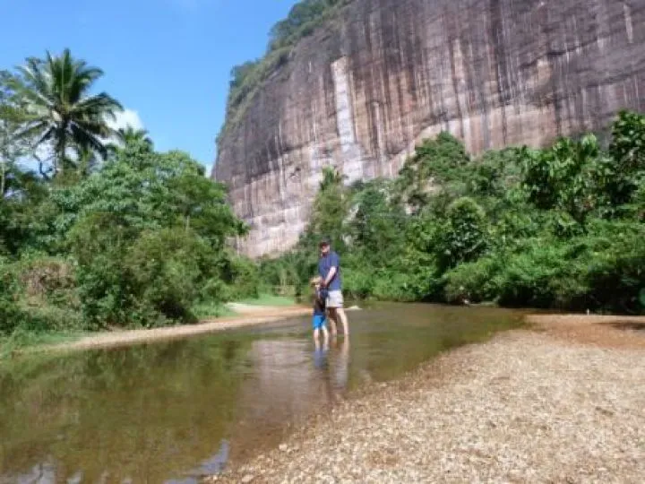 Die Schlucht von Bukittingi ist wunderschön. Als ob man durch die Wüste läuft, mit dem Dschungel über einem. Und in der Ferne die steilen Wände. Der kleine Fluss, der die Schlucht geformt hat, spielt in der Trockenzeit kaum eine Rolle.