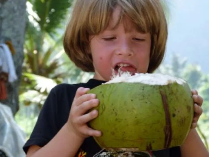 Das Haus seiner Schwiegermutter steht am Rand der Reisfelder, zwischen etwa zehn anderen Häusern, von denen zwei im alten Minangkabau-Stil gebaut sind. Diese alten Stilhäuser haben wunderschöne, nach oben geschwungene Dächer mit gebogenen Traufen. Wie ein Mondsichel auf ihrem Rücken. Diese beiden haben eine schön verzierte kleine Veranda an der Vorderseite. Sobald wir in Sicht sind, klettert ein magerer alter Mann aus dem kleinen Dorf mit einer großen Machete auf dem Rücken einen Palmbaum hinauf. Blitzschnell klettert er über den mehrere Meter langen, senkrechten glatten Stamm bis zu den grünen Palmblättern, wo die Kokosnüsse hängen. Er bricht drei ab und wirft sie herunter. Unten schlägt Ikbal mit seiner Machete die Kokosnuss auf, so dass ein kleines Trinkloch erscheint. Zuerst trinkt sein Sohn. Und dann dürfen Sil und Luna. Köstliches süßes Kokoswasser stillt den Durst wie das Beste.