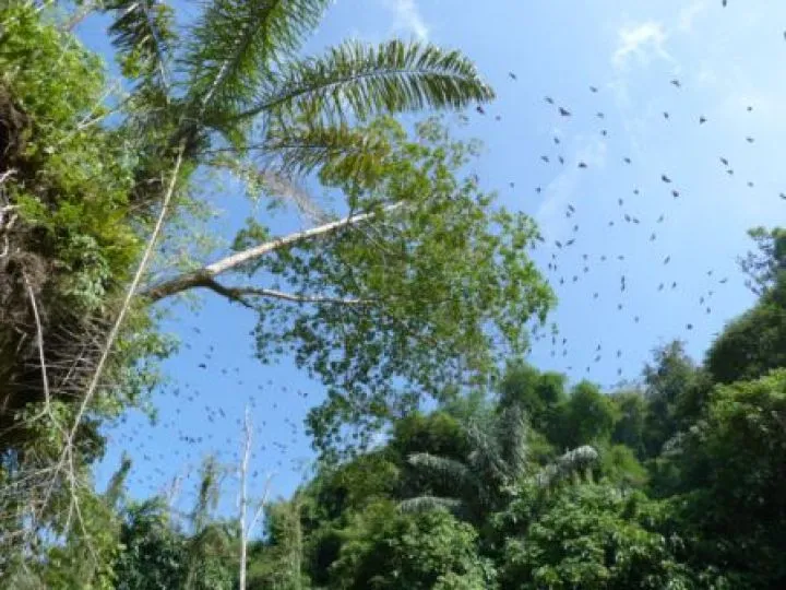 Wir gehen bis zum Ende der breiten Schlucht. Der Fluss macht eine Biegung und ich blicke nach oben. An einigen Bäumen hoch über uns hängen schwarze Dinge. Zuerst denke ich an Kapokbäume mit ihren großen, länglichen dunklen Früchten, die später aufbrechen und das flauschige weiße Kapok nach außen drücken. Aber nein, diese Früchte sind größer als Kapok. Und an den Seiten haben sie seltsame Flappen. Glänzen die? Bild ich mir das ein? Dody zeigt nach oben. Fliegende Hunde, sagt er. Ich schrecke fast zurück. Jeemig! Das müssen riesige Tiere sein, denn sie hängen sehr hoch und somit weit weg, und ich sehe sie so deutlich. Und wie viele es sind! Ich kann es jetzt wirklich gut sehen. Hunderte hängen dort! Soweit ich von hier aus in der Schlucht sehen kann, sind fünf Bäume ganz gefüllt mit kopfüber hängenden fliegenden Hunden. Sie schlafen, bis es Abend wird, und dann fliegen sie weg. Auf der Suche nach Obst. Morgens kommen sie genau an diesen Ort zurück. Ein wunderbares Phänomen. Sie sehen sehr ähnlich aus wie Fledermäuse, nur in enormem Maßstab. Mit ausgebreiteten Flügeln sind sie sicher mehr als einen halben Meter breit. Ich kann nicht aufhören, sie anzustarren. Ich kann nicht genug davon bekommen. Insgeheim wünsche ich mir, dass es Abend wird. Dann werden sie fliegen. Kaum habe ich es gedacht, beginnt Dody in die Hände zu klatschen und ruft durch die Schlucht. Waaaaaaaah. Und mein lieber Himmel, sie wachen auf! Zuerst fliegen ein paar auf, aber bald sieht es buchstäblich schwarz aus von den tief fliegenden Hunden. Ich weiß nicht, wo ich hinschauen soll. Ich könnte vor Freude schreien. Was für eine Macht! Ich habe das Gefühl, ich könnte sie berühren, obwohl sie mindestens vier Meter über mir fliegen. Ich sehe sie so deutlich. Ihre Ohren ragen stolz über ihren Kopf hinaus, sogar das Gefühl, ihre Augen zu sehen. Sicherlich kann ich die Klauen an der Vorder- und Rückseite ihrer riesigen Flügel sehen, mit denen sie sich an den Ästen festklammern, um zu schlafen. Ihre Flügel sind ein wenig gruselig. In der Form von fast durchsichtigen Vampirflügeln mit ein paar Sehnen dazwischen. Ich sehe die Flügel deutlich glänzen. Als wären sie aus Gummi mit einer plastikartigen Beschichtung. Ein bisschen unheimlich. Sie fliegen weiterhin umher. Es dauert sicher 10 Minuten, bis sie wieder ihren Schlafplatz gefunden haben. Ich habe die ganze Zeit Gänsehaut auf den Armen und schaue mit offenem Mund zu. Was für seltsame Organismen gibt es auf diesem Planeten. Und hier erlebe ich es einmal mehr: der Mensch ist nur ein Glied in der Kette. Ich sollte mich auch mehr wie ein Glied verhalten.