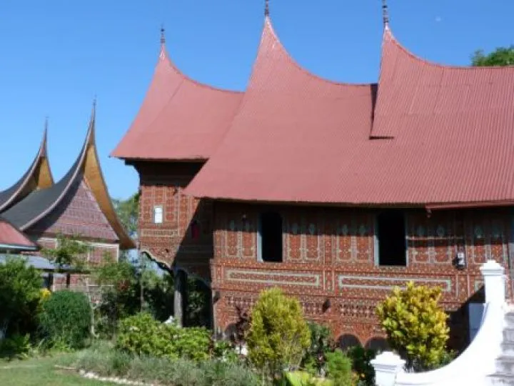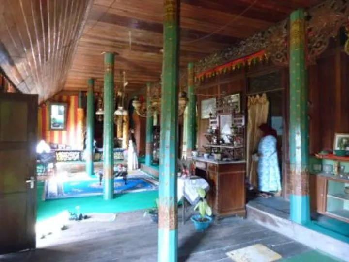 Eine Frau mit einer großen Brille und einem modernen Wollmütze auf dem Kopf steht auf der Wiese vor einem prächtig verzierten Minakabau-Haus in Padangpangjang. Sie winkt. Und ich gehe vorsichtig auf sie zu. Meine Tante lebt hier, sagt sie und deutet nach hinten. Hinter ihr sehe ich eine gebückte Frau mit einem riesigen weißen Kopftuch, das bis knapp über ihre Augen reicht. Sie zeigt ihr einziges sichtbares Zahn und schleicht zum Treppchen, das Zugang zum breiten Holzhaus auf Pfählen gewährt. Wir stehen vor einem Familienhaus der Minakabau und in wenigen Sekunden werde ich darin stehen. Kein Museum, sondern ein bewohntes Haus. Ein reiches Haus. Das Dach hat die Form einer Mondsichel. Das Holz der Fensterrahmen, Regenrinnen und Dachkonstruktion ist wunderschön bearbeitet und mit schönen abstrakten Motiven bemalt. Ich lasse meine Sandalen draußen stehen und trete auf den weichen, dunkelroten Teppich. Innen komme ich in einen großen Raum. Der Boden ist mit Teppich ausgelegt und es stehen hier und da große, dicke, dunkelholze Säulen, auf denen das Dach ruht. Die Säulen sind ebenfalls bearbeitet. Es gibt keine Stühle. Nur zwei kleine, niedrige runde Tischchen mit einer Vase voller frisch gepflückter Blumen. Eines auf der linken Seite des Hauses und eines auf der rechten Seite. Es stehen einige schöne Holzvitrinen mit sichtbar teurem Porzellan und Glaswaren. In der Mitte hängt ein schwerer bronzener Kronleuchter mit Glühlampenhaltern. Ansonsten ist dieser Raum leer. Auf der Rückseite gibt es einige Türen zu den Räumen dahinter. Das müssen kleine Räume sein, angesichts des großen Raumes, in dem ich mich jetzt befinde. Das Haus war von außen betrachtet nicht viel größer. Das sind die Schlafzimmer der Frauen. Die Dame, die uns nach drinnen winkt, spricht fließend Englisch. Und sie erzählt gerne. Mit gierigen Atemzügen dazwischen. Dies ist das Haus ihrer Tante und sie deutet auf die Frau mit dem weißen Kopftuch, die inzwischen auf dem Boden bei einem der zwei Holztische Platz genommen hat. Sie sitzt entspannt mit elegant gefalteten Beinen, obwohl sie mindestens 80 Jahre alt sein muss. Ihr Mann hatte zwei Frauen und er baute dieses Haus für sie. Ihre Tante bekam den linken Teil des Hauses und die andere Frau des Mannes den rechten Teil. Der linke Teil wird von der Tante und einer Tochter bewohnt, der rechte Teil wird von der anderen Frau und ihrer Familie nicht genutzt, aber die Tante hält ihn dennoch in Schuss. Und jetzt sehe ich es auch. Obwohl es ein offener Raum ist, sehe ich deutlich an den Möbeln, dass es zwei Haushalte bedient hat. Auf jeder Seite steht ein niedriges runden Tisch und es gibt einige Vitrinen auf beiden Seiten.