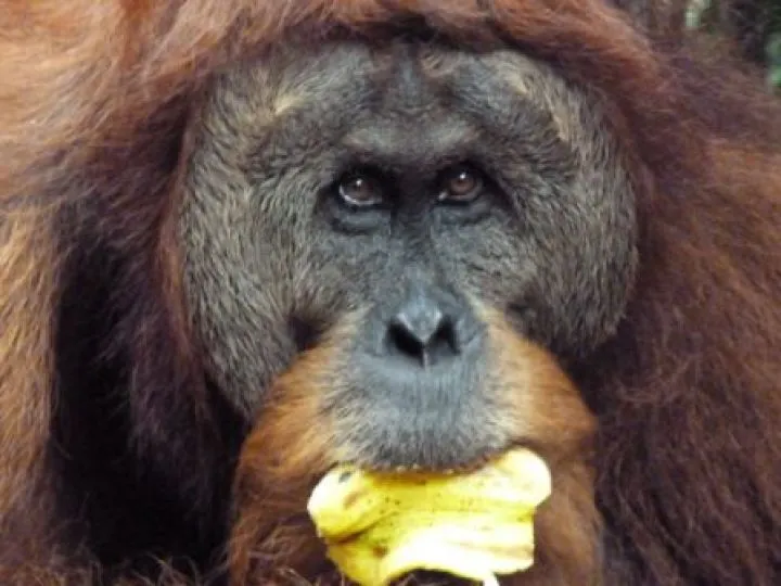 hängen neugierig über unseren Köpfen. Und kommen dann herunter. Wir stehen noch keine zwei Meter von ihnen entfernt. Süße Köpfe, aufrecht stehendes rotes Haar. Große schwarze glanzvolle Handflächen. Die Mutter hat einen Katarakt an einem Auge oder ist sogar schon ganz blind. Das kann ich so sehen. Und dann? Und dann darf Sil ihnen ein paar Bananen und Ananas geben. Ich weiß nicht, was mit uns passiert! Er streckt seine Hand mit der Banane aus und Ma Oetan kommt einfach und holt sie sich. Vorsichtig nimmt sie sie ihm ab. Und klettert wieder einige Meter den Baum hoch, um sie dort mit ihrem Kind zu teilen. Ihr Kind ist übrigens fast zwei Jahre alt und trinkt immer noch von ihrer Brust. Nach den Bananenstückchen nuckelt sie noch ein wenig an der bekannten Brust. Ma schaut etwas vor sich hin und sieht glücklich und zufrieden aus. Sil sieht seinerseits gelassen zu. Als ob es für ihn das normalste der Welt wäre, dass er einen halb wilden Orang-Utan füttert.
