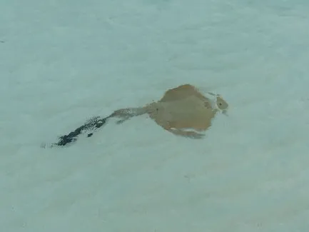 Mit einem langen Stock, an dessen Ende sich ein Haken befindet, fischt Haleem das Seil, das hier mitten im Ozean über Wasser schwappt. Geschickt fasst er das Seil und schlägt es um den dafür vorgesehenen Holzpfahl an der Bugspitze des Bootes. So, wir liegen still. Mit einem Blick ins Wasser sieht er sie schon und ruft uns zu: 'Okay, Leute.' Rochen und Haie zur rechten Seite des Bootes. Es wimmelt von ihnen. Springen Sie ruhig hinein und gehen Sie nicht weit vom Boot weg. Die Damen und Herren kommen von selbst zu uns! Nicht anfassen oder versuchen, sie zu streicheln! Genießen Sie aus der Ferne, Allright? Und da gehen wir. Eins nach dem anderen springen wir ins Wasser und eine Sekunde später sind wir von sechs Rochen umgeben, die in aller Ruhe unter uns her schwimmen. Wir sehen sie aus schrecklich nah. Beinahe beängstigend. Aber vor allem überwältigend schön. So ruhig bewegend und doch so groß. Ich schätze, sie sind fast einen Meter breit und anderthalb Meter lang, wenn man ihren schmalen Schwanz mit zählt. Sind sie denn nicht gefährlich? 'Nein', sagt Haleem. 'Solange Sie nicht auf ihnen stehen oder an ihrem Schwanz ziehen, tun sie nichts. Ich habe in den 22 Jahren, die ich hier arbeite, noch nie von einem Unfall gehört.'