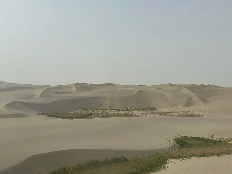 Die Zugfahrt dauert etwa zwölf Stunden und führt über eine der neuesten Eisenbahnstrecken Chinas, ein beeindruckendes technisches Meisterwerk, das mitten durch die Wüste verläuft. Entlang der Strecke sehen Sie überall grüne Streifen, die verhindern sollen, dass der sich ständig bewegende Sand die Gleise bedeckt. Alle paar Kilometer stehen kleine Häuser in der Einöde. Dort leben Menschen, deren einzige Aufgabe es ist, diese Grünstreifen zu pflegen und zu bewässern.