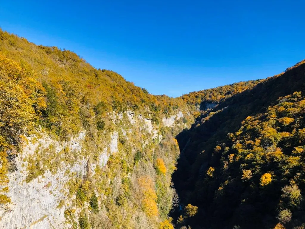 Eine weitere atemberaubende Schlucht ist der Okatse-Canyon, der wesentlich rauer und abenteuerlicher ist als Martvili. Hier können Sie entlang eines Pfades gehen, der an der Seite der Schlucht befestigt ist, und schließlich bei dem „Skywalk“ ankommen, einer Glasplattform, die über die Schlucht hinausragt und Ihnen einen schwindelerregenden Blick über das Tal darunter bietet. Der Spaziergang und die Aussicht vom Skywalk sind perfekt für alle, die ein wenig Nervenkitzel mögen.