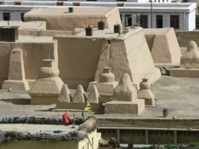 In Tabo befindet sich eines der berühmtesten Klöster im tibetischen Kulturraum. Von außen sieht das Kloster ganz anders aus als andere tibetische Klöster. Innerhalb einer großen Lehmmauer stehen einige einfache Lehmgebäude und Lehmtupas. Diese Architektur erinnert eher an Mali, Jemen oder ein wenig an die Häuser in der tibetischen Aba-Region. Es sieht auch nicht sofort wie ein beeindruckendes Kloster aus. Aber die Gebäude beherbergen möglicherweise die bemerkenswertesten Fresken und Statuen aller tibetischen Klöster. Die Fresken und Statuen sind über 1000 Jahre alt, und da das Kloster nie zerstört wurde, ist es eines der wenigen Klöster, das noch fast genau so aussieht wie vor 1000 Jahren. 996 wurde das Kloster von Ringchen Zangpo gegründet, einem der berühmtesten Gelehrten im tibetischen Buddhismus und dem heiligsten Mann, der Spiti hervorgebracht hat.