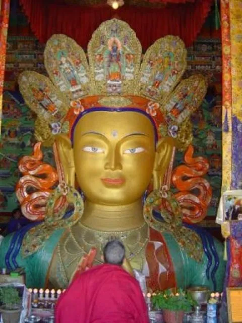 Auch besuchen wir das Kloster Thikse, das auf einem Hügel direkt außerhalb der Stadt liegt. Das Kloster besteht aus zwölf Etagen. Es ist bereits achthundert Jahre alt, hat viele alte Tempel und wird von sechzig Mönchen bewohnt. Hier steht die bekannteste Buddhastatue Ladakhs, der Maitreya-Buddha (der Buddha der Zukunft).