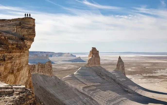 Auf dem Rückweg nach Aktau besuchen Sie die Karagiye-Senke, die sich von Norden nach Süden über 80 km mit einer Breite von 25–30 km erstreckt. Der tiefste Punkt von Karagiye liegt im südlichen Teil etwa 132 m unter dem Meeresspiegel, was sie zu einer der tiefsten der Welt macht. Hier können Sie fossile Überreste mariner Fauna aus dem Paläogen finden – Wale, Haie, Rochen, Knochenfische, Schildkröten und Schalen ausgestorbener Weichtiere.