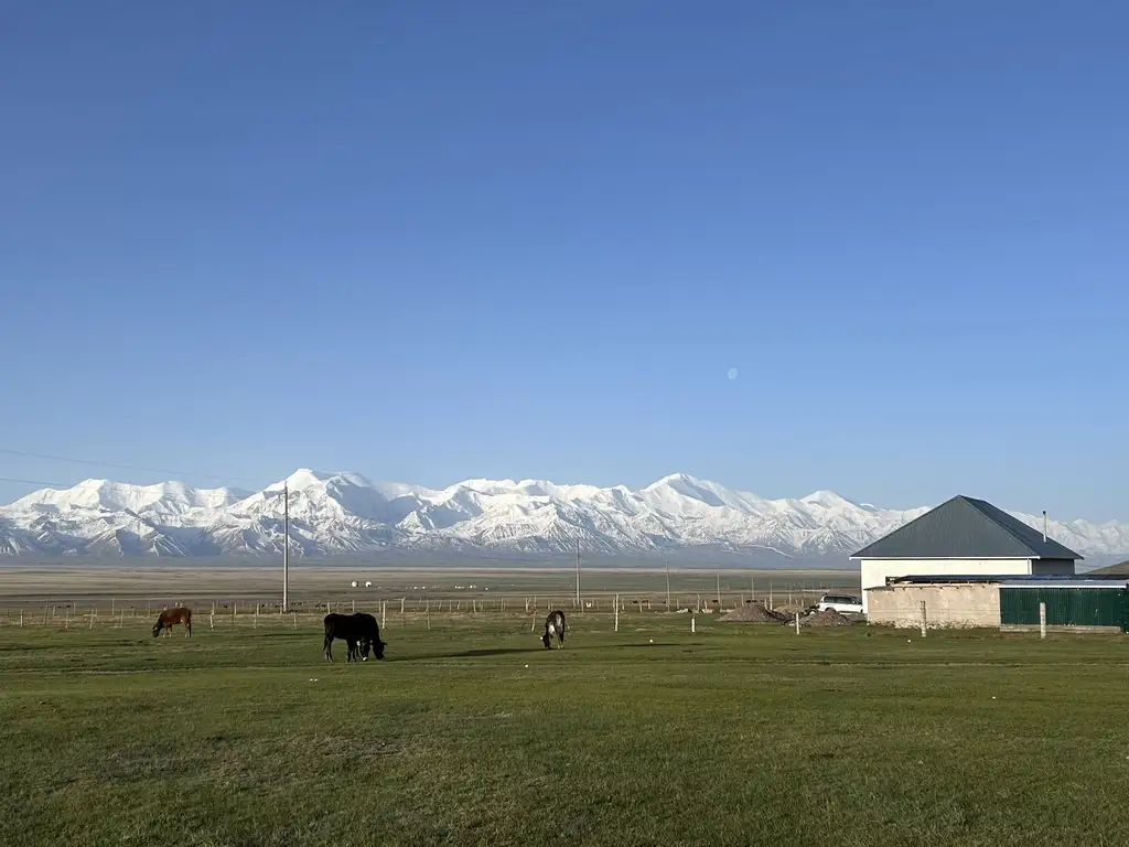 Einmal im Tal angekommen, passieren Sie das Dorf Sary Tash, das in einer atemberaubenden Umgebung liegt. Das Tal wird von einem mäandernden Fluss durchzogen, mit dem imposanten Pamir-Gebirge und dem herausragenden Pik Lenin auf der einen Seite und der Pamir-Alai-Gebirgskette auf der anderen Seite. Bei klarem Wetter erstreckt sich die Aussicht über das gesamte Pamir-Gebirge, wobei die weißen Berggipfel eindrucksvoll gegen den blauen Himmel leuchten.