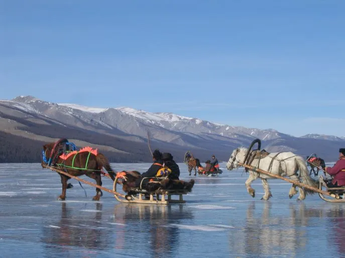 Ein kurzer Flug bringt uns zum Khovsgol-See, der in der mongolischen Taiga liegt. Dieser wunderschöne See ist im Winter vollständig gefroren. Rund um den See finden verschiedene Aktivitäten statt, darunter traditionelle Tänze, schamanistische Tänze und sogar ein echtes Schlittschuhrennen. Es ist ein wunderbares Erlebnis, mit einer Schlittenfahrt über den gefrorenen See zu gleiten.