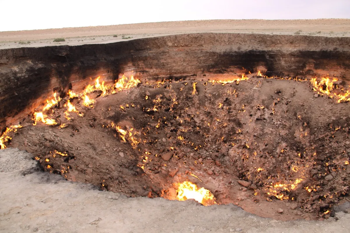 Das Tor zur Hölle: Dieser Gaskrater in der Wüste brennt seit Jahrzehnten. Der Krater entstand durch einen Fehler sowjetischer Geologen. In den 1970er Jahren wurde hier nach Öl und Gas gebohrt. Der Boden brach ein und es wurde ein unterirdisches Höhlensystem sowie eine Gasvorräte entdeckt. Das Gas breitete sich durch das Höhlensystem aus. Die Geologen dachten, das Problem zu lösen, indem sie das Gas anzündeten. Diese Krater brennt noch immer. Besonders nachts ergibt sich ein beeindruckendes Bild; die verlassene Wüste und das brennende Feuer.