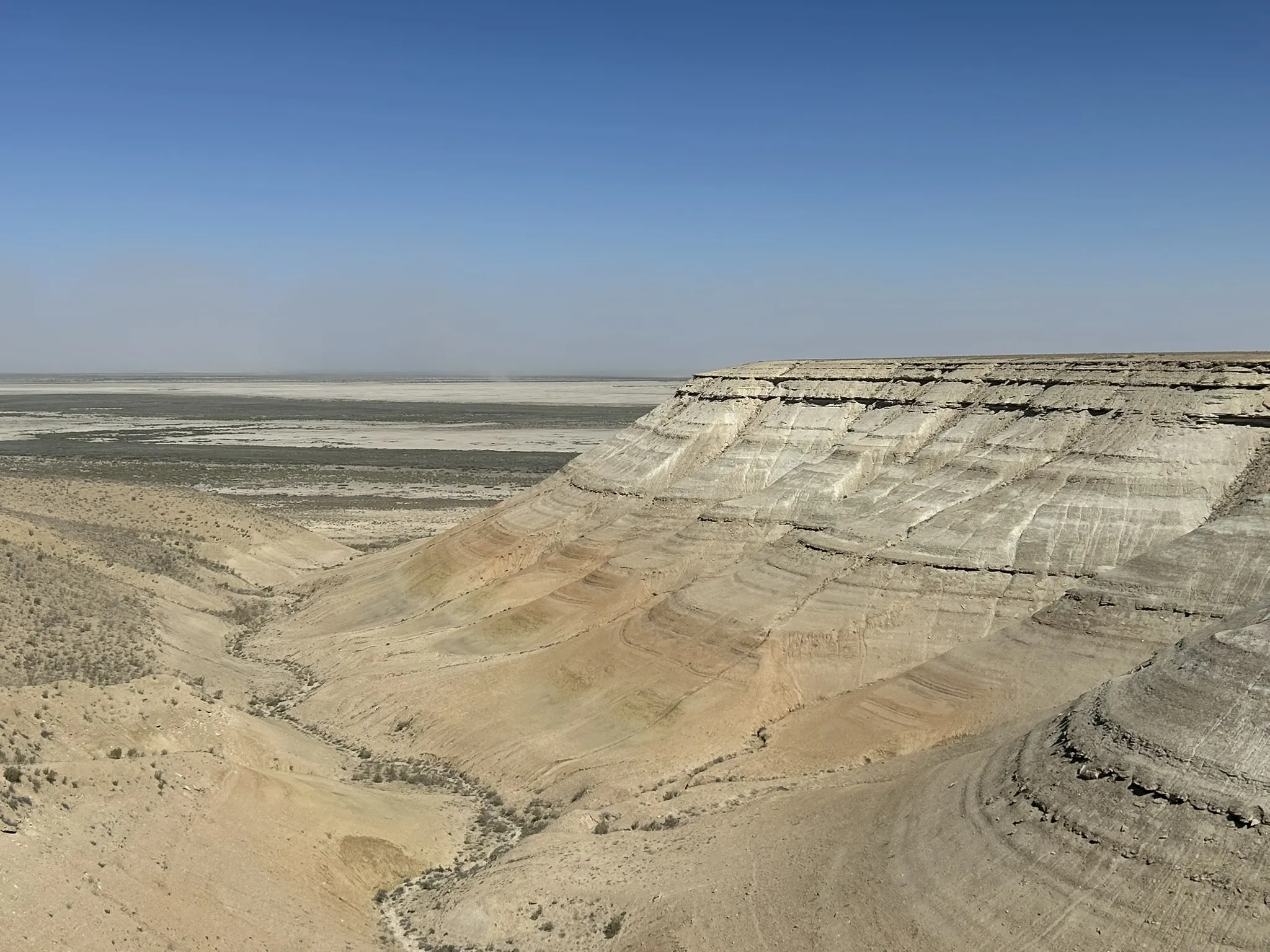 Anschließend fahren Sie teilweise über den Grund des Aralsees in Richtung des Ustyurt-Plateaus. Nach einigen Stunden sehen Sie die Felswand dieses Plateaus auftauchen. Von oben haben Sie einen schönen Blick auf die Canyons. Etwas weiter halten Sie an einem alten Friedhof und fahren dann weiter zu den Ufern des Aralsees. Hier können Sie, wenn Sie möchten, ins Wasser gehen. Erwarten Sie jedoch kein erfrischendes Bad, sondern eher ein Erlebnis wie im Toten Meer. Auch hier können Sie aufgrund des hohen Salzgehalts auf dem Wasser treiben.