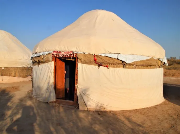Sie reisen dann weiter in die Wüste, wo Sie in einer einfachen Jurte in der Wüste übernachten, nicht weit vom Aydarkul-See.