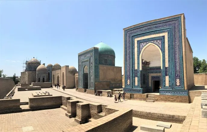 Auf einem Hügel am Rande des ehemaligen Afrasiab liegt das Komplex von Sjah-i Zinda, ausgestattet mit den schönsten Mosaiken, die Usbekistan zu bieten hat. Diese Nekropole (Totenstadt) enthält viele prachtvolle Mausoleen.