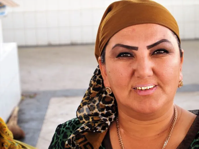 Das bunteste ist der Teppichbereich. Hier finden Sie überwiegend Frauen in geblümten Kleidern mit bunten Kopftüchern, die auf riesigen Stapeln von Teppichen sitzen. Große, kleine, günstige, teure, antike und Fabrik-Teppiche; hier finden Sie alles. Möchten Sie eine Jacke oder eine Pelzmütze kaufen, turkmenische Schmuckstücke oder sowjetische Utensilien? Alles ist möglich. Und natürlich gibt es auch eine unendliche Auswahl an Gemüse, Obst, frischem Brot, Milchprodukten sowie preiswerter Textilien und Waren aus China.