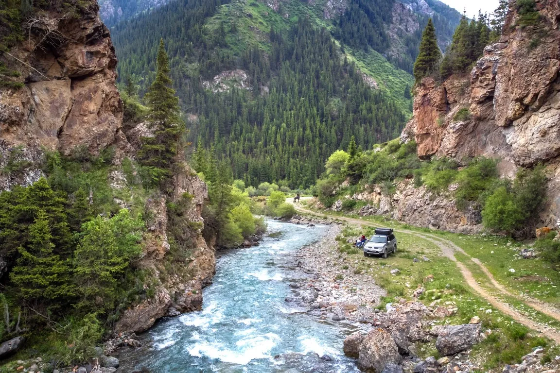Kirgisien ist ein wunderbares Land, um es mit einem Land Cruiser und Dachzelt zu erkunden. Sie können überall frei campen, die Natur ist atemberaubend. Die Berglandschaft ist überwältigend, von rauen Schluchten bis zu idyllischen Tälern, von steilen Bergpässen bis zu Begegnungen mit Nomaden.